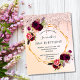 Sur le devant : Une invitation pour une fête d'anniversaire de 50 ans, 50ème (ou tout âge). Un arrière - plan rose doré, rose vif et sombre, avec un cadre géométrique faux or. Décoré de fleurs violettes foncées et bordeaux, de plumes roses et boho. Faux parties scintillant rose d'or gouttes. Modèles pour un nom et les détails de la fête. Le nom est écrit avec un script de style écrit à la main, des lettres de couleur grise. Dos : or Rose, arrière - plan de couleur sombre et rose vif.