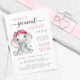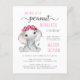 Une mignonne invitation à la douche pour petite fille à petit budget avec "Our Sweet Little Peanut Is On Her Way" écrite dans un mélange de typographie rose et gris mou et un joli script avec des swashes, et une aquarelle d'un éléphant pour petite fille avec une couronne de fleurs roses sur la tête. Personnalisez facilement les noms du bébé et de la mère dans la typographie rose et les détails de la douche dans la typographie grise moderne simple