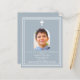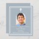 Arrière - plan bleu Dusty, décoré d'un cadre blanc, et d'une croix blanche Personnalisez et ajoutez un nom photo et des détails. Texte blanc. Cadre photo en forme d'arc. 1 feuille = 1 invite imprimé bord à bord.