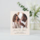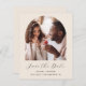 Cette simple et minimaliste carte Save the Date présente une arche photo boho au-dessus des mots "Save the Date" dans un élégant script d'écriture manuscrite blanche, suivi des noms du couple, date mariage et ville en sans serif police sur un arrière - plan beige. Ajoutez un message plus détaillé avec des informations supplémentaires sur l'inverse.