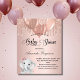 Pour un baby shower, célébrer une petite fille. Un arrière - plan rose à l'apparence métallique. Décoré d'or rose, de gouttes de parties scintillant rose, d'un look décapant de peinture, de ballons et d'une mignonne petite fille d'éléphant. Personnalisez et ajoutez le nom de la mère à être le nom et les détails de la fête. Le nom et le texte : Baby shower sont écrits avec un script de style écrit à la main