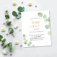 Bienvenue dans un Baby shower élégant. Un arrière - plan blanc chic. Décoré avec des feuilles d'eucalyptus couleur verte, sprigs. Personnalisez et ajoutez le nom de la mère à être et détails paraty. Lettres noires et dorées.