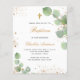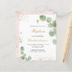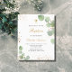 Un arrière - plan blanc décoré d'une végétation d'eucalyptus et d'une poussière de parties scintillant en faux or. Personnalisez et le nom des enfants et les détails de la cérémonie. Lettres noires et dorées. Dos : arrière - plan rose vif avec poussière de parties scintillant en faux or.