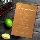 Le menu de ce bar rustique à mariage d'or présente une élégante typographie blanche superposée sur un dégradé de tons de terre sobre. Les teintes simples orange pâle et marron suivent les tendances d'automne actuelles pour un mariage bohème cet automne. Complétez le look avec votre script minimaliste sur la fondu de couleur sur cette liste de boissons.