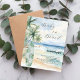 Une élégante invitation au Baby shower. Une plage de sable couleur eau, des vagues de l'océan et des palmiers en arrière - plan, et une planche de surf verte neutre pour les deux sexes sur la plage. 1 feuille = 1 invite imprimé bord à bord.