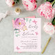 Un arrière - plan rose pâle et doux. Décoré d'une rose rose rose et d'une verdure d'eucalyptus vert aquarelle et de papillons. Personnalisez et un nom et des détails du parti. Texte : Bébé en fleur. 1 feuille = 1 invite imprimé bord à bord.