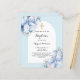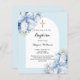Un cadre en arc blanc et un arrière - plan bleu clair. Décoré de fleurs et arcs bleus et blancs. Une croix d'or. Personnalisez et ajoutez un nom et des détails. 1 feuille = 1 invite imprimé bord à bord.