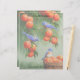 Deux bleuets de l'ouest perchent dans un pêcher tandis qu'un troisième bleu est assis sur un panier en bois tressé rempli de fruits frais récoltés prêts à être commercialisés. Accentué par un arrière - plan à motifs bleus assorti.