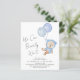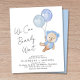 Boho budget-friendly bébé garçon couples douche invitation avec une jolie aquarelle illustration d'un ours en peluche bleu flottant avec des ballons, et "We Can Bearly Wait" dans un script de calligraphie manuscrit. Ajoutez les noms des parents à être et les détails de la douche dans une simple typographie.
