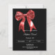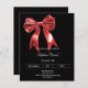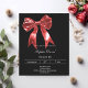 Un arrière - plan noir, décoré d'un grand arc rouge. Personnalisez et ajoutez un nom et des détails du parti. Texte blanc. 1 feuille = 1 invite imprimé bord à bord.