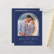 Cette simple et minimaliste carte Save the Date présente une arche photo boho au-dessus des mots "Save the Date" dans un élégant script d'écriture manuscrite blanche, suivi des noms du couple, date mariage et ville en sans serif police sur un arrière - plan bleu marine. Ajoutez une photo horizontale et un message plus détaillé avec des informations supplémentaires au dos.