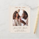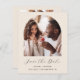 Cette simple et minimaliste carte Save the Date présente une arche photo boho au-dessus des mots "Save the Date" dans un élégant script d'écriture manuscrite blanche, suivi des noms du couple, date mariage et ville en sans serif police sur un arrière - plan beige. Ajoutez une seconde photo horizontale et un message plus détaillé avec des informations supplémentaires sur l'inverse.