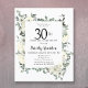 L'élégante invitation à la fête du 30e anniversaire présente un cadre botanique de fleurs blanches et de feuilles verts. Le nom de la personne d'anniversaire est écrit dans un texte traditionnel. Tout le texte peut être facilement édité pour créer juste le ton de fête approprié.