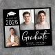 Faire-part moderne de graduation noir à petit budget avec 3 photos et "Graduate" dans un audacieux script blanc contemporain. Ajoutez le nom du diplômé, l'année de classe et l'école ou l'université en simple typographie blanche.