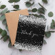 Un carte de remerciements d'anniversaire féminin et élégant. Une couleur noire arrière - plan. Avec de la poussière de parties scintillant en faux argent. Sur le devant, script écrit à grande main et texte : Merci. Retour : Personnalisez et ajoutez Votre note de remerciement et votre nom. Le nom est écrit avec un script de style moderne écrit à la main avec des swashes. Pour que les swashes ne suppriment que le nom de l'échantillon, laissez les espaces ou émoticônes devant et après le nom.