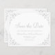Cet élégant mariage formel d'inspiration vintage sauver la carte de date comprend le texte en écriture gris argent et les polices serif, encadrées par un délicat motif vintage de vin argenté. Le cadre est répété à l'envers.