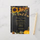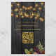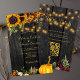 Campagne rustique traditionnel récolte botanique automne tournesol, fleurs d'automne et citrouille BUDGET abordable tout en un code QR en ligne carte de faire-part de mariage RSVP sur un bois de grange brun foncé comme arrière - plan avec lampes à cordes. ++++++++++++++++++++++++++++++ Idéal pour les mariages de jardin extérieur de la ferme.