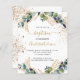 Un arrière - plan blanc décoré de verdure d'eucalyptus et de feuilles dorés et de parties scintillant en faux or tombe. Personnalisez et le nom de l'enfant et les détails de la cérémonie. Lettres noires et dorées. Retour : arrière - plan blanc avec gouttes de parties scintillant en faux or