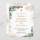 Pour le baptême de 2 enfants. Un arrière - plan blanc décoré de verdure d'eucalyptus et de feuilles dorés et de poussière de parties scintillant en faux or. Personnalisez et les noms des enfants et les détails de la cérémonie. Lettres noires et dorées. Dos : arrière - plan blanc avec poussière de parties scintillant en faux or.