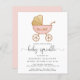 Cette adorable invitation à saupoudrer petite fille à petit budget présente une aquarelle rose pastel et or d'un chariot bébé rétro. Vous pouvez personnaliser le texte sur le chariot ou laisser vide. "baby shower" est écrit dans un script élégant avec des swashes.