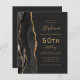 Le bord gauche de cette élégante invitation moderne à la fête du 50e anniversaire comporte une bordure en aquarelle noire ornée d'une fausse parties scintillant dorée. Le texte personnalisable combine écriture manuscrite dorée, cuivre et polices italiques sur un arrière - plan noir ardoise. Ajoutez les instructions RSVP au verso de la carte, ainsi qu'un code QR que vous pouvez analyser pour répondre en ligne.