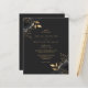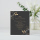Ce faire-part de mariage fleuri romantique présente des bouquets de fleurs noires, agrémentés d'un feuillage en faux feuille d'or, dans deux coins. Les noms du couple apparaissent dans la police serif de couleur or classique, avec le texte restant en italique, sur un arrière - plan noir ardoise. Le dos de la carte est noir ardoise solide.