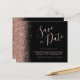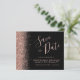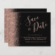 Cet élégant budget enregistrer la carte date dispose d'une bordure de parties scintillant en or rose le long du bord gauche. Le texte personnalisable combine un script d'écriture manuscrite rose rose, des polices de caractères copperplate et italique sur un arrière - plan noir. L'envers présente une parties scintillant en or noir et rose assortie.