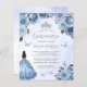 Cette jolie invitation de quinceañera comporte une bordure de roses bleus avec un feuillage de parties scintillant en faux argent sur un arrière - plan d'aquarelle bleu. Une tiare argentée, une fille aux cheveux foncés en robe de princesse bleue et de petits papillons bleus décorent le texte. Le mot "Quinceañera" et le nom de l'invité d'honneur apparaissent dans un élégant script d'écriture gris argenté, avec le texte restant dans la police grise sans serif. Ajoutez du texte supplémentaire au verso, ainsi qu'un code QR pour aider vos invités à visiter votre site quinceañera et RSVP en ligne.