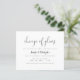 Oui ! Des circonstances imprévues se produisent, et quand elles le font, vous pouvez facilement faire savoir à vos invités d'une manière amusante et facile que vous avez besoin de reporter votre date de mariage avec cette carte minimaliste de report mariage noir et blanc. Avec "changement de plan" dans une police de calligraphie chic avec une simple typographie serif. Dans le cadre de la sélection du budget ici sur Zazzle, ces invitations ne sont pas fournies avec des enveloppes et ne s'insèrent pas dans une enveloppe de taille standard. La taille la plus proche est A6 mais il y aura un écart d'environ un demi-pouce. Si vous n'avez pas peur du manque de douceur, vous pourriez utiliser des enveloppes A6 aussi largement disponibles. Sinon, cette conception peut être transférée dans un format standard 5x7 (avec enveloppes) à l'aide de l'outil de transfert de conception. À titre d'exemple, au moment de la rédaction du présent document, 100 invitations budgétaires (y compris une remise sur le volume) coûteraient environ 39 $, alors que 100 invitations standards 5x7, y compris des enveloppes, coûteraient environ 135 $. Votre kilométrage peut varier en fonction des codes promo disponibles de Zazzle, des ventes à l'échelle du site ou des changements de prix.