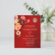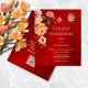 Cette version a un titre pour ajouter les NOMS DE VOTRE PARENT. Fleurs de pivoines rouges, oranges et jaunes avec un arrière - plan chatoyant rouge. Faire-part de mariage chinoise avec un double symbole de bonheur en or. Modifiez le code qr à l'arrière en ajoutant votre URL de votre site Web mariage.