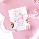 Une invitation à l'anniversaire mignonne et girly avec des beignets aquarelle, une calligraphie de script chic et un arrière - plan de bande rose à l'arrière.