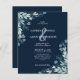 Faire-part de mariage moderne. Avec des fleurs de feuillage rustique et de minuscules fleurs bleues sur un arrière - plan bleu marine. Facile à customiser avec vos informations uniques.