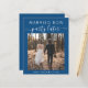 Élégant et économique, le classique classique elopement bleu ou le petit faire-part mariage pour informer la famille et les amis que vos plans de mariage ont changé, vous obligeant à fuir ou à réduire le nombre d'invités à votre mariage, mais que vous allez accueillir une réception ou une fête à l'avenir. Le devant présente votre photo et "Marié maintenant, Parti plus tard" dans un mélange de typographie blanche simple et d'un script blanc tendance avec des swashes. Sous votre photo, vous pouvez ajouter vos prénoms et votre date de mariage. Au verso, vous pouvez personnaliser votre message de manière plus détaillée et vos noms dans un script de type signature.