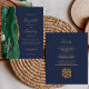 Le bord gauche de cette élégante faire-part de mariage moderne est orné d'une bordure en aquarelle vert émeraude, recouverte d'une parties scintillant en faux or. Le texte personnalisable combine écriture manuscrite couleur or, cuivre et polices italiques sur un arrière - plan bleu marine. L'envers offre de l'espace pour les détails mariages sur un arrière - plan bleu marine solide, ainsi qu'un code QR que les invités peuvent scanner pour visiter votre site Web et RSVP, qui économise le coût d'impression et d'envoi de cartes RSVP séparées.