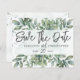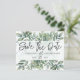 Cette conception moderne et élégante sauver la date a un thème botanique, qui comprend eucalyptus et feuillage en aquarelle avec élégante typographie manuscrite. Facile à customiser avec vos propres informations.