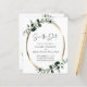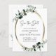 Budget Eucalyptus Gold Metallic Wedding Enregistrer la date Invitation... Notre luxueuse carte Botanique Save the Date présente un cadre or métallique ovale agrémenté de feuilles d'eucalyptus vert poussiéreux et émeraude créant une bordure naturelle pour le texte faire-part à l'intérieur. Le verso de la carte contient les informations de votre site Web mariage et un modèle graphique de code QR que vous pouvez remplacer par votre propre graphique de code. Tous les exemples de texte peuvent être facilement révisés avec vos propres détails sur le modèle de personnalisation.