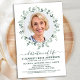 Funérailles Modernes Du Mémorial Eucalyptus / Célébration De L'Invitation À Vie. Ces invitations funéraires sympathiques présentent une photo dans un modèle de couronne d'eucalyptus vert. Personnalisez cette célébration de l'invitation funéraire de la vie avec vos proches photos, nom & dates, détails de l'événement. DROIT D'AUTEUR © 2021 Judy Burrows, Black Dog Art - Tous droits réservés. Budget Eucalyptus Photo Célébration De L'Invitation De Vie