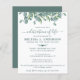 Funérailles Mémorial Rustique / Célébration De La Vie Invitation. Ces invitations funéraires sympathiques présentent une élégante et moderne végétation botanique d'eucalyptus sur un design moderne blanc et vert sage. Personnalisez cette célébration de l'invitation funéraire de la vie avec vos proches nom & dates, détails de l'événement. DROIT D'AUTEUR © 2021 Judy Burrows, Black Dog Art - Tous droits réservés. Budget Eucalyptus Vert Célébration De La Vie