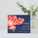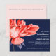 Invitation de mariage époustouflante et élégante, avec une magnifique fleur de dahlia en fleurs dans une palette d'aquarelle aux nuances d'orange rouge riche et aux feuilles bleu violet sur la gauche de la carte.