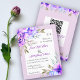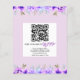 FAIRE-PART DE MARIAGE lilas floral violet BUDGET avec code QR pour RSVP. Il affiche des bouquets de fleurs dans les tons violets et bleus aux coins tandis que votre texte est placé dans un cadre blanc avec une bordure lilas. L'arrière comprend des guirlandes fleuries sur les parties supérieure et inférieure et le code QR pour RSVP.