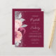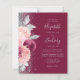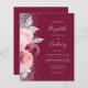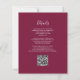 Le bord gauche de cette élégante faire-part de mariage moderne est orné d'un bouquet floral aux tons bordeaux et rose roux, paré de fausse feuille argent et de faux feuillage de parties scintillant et parsemé de fausse parties scintillant argentée. Le texte personnalisable combine écriture manuscrite gris argenté, copperplate et italique sur un arrière - plan bordeaux. L'envers offre de l'espace pour les détails mariages sur un arrière - plan bordeaux solide, ainsi qu'un code QR que les invités peuvent scanner pour visiter votre site Web et RSVP.