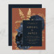 Cette élégante faire-part de mariage moody présente un bouquet floral luxuriant et romantique en bleu marine avec fausse feuille d'or et feuillage de parties scintillant sur un arrière - plan rouille ou orange brûlé. Customisez le texte de couleur or dans des polices élégantes sur un rectangle bleu foncé. L'envers offre de l'espace pour les détails du mariage sur un arrière - plan bleu foncé solide, ainsi qu'un code QR que les clients peuvent scanner pour visiter votre site Web et RSVP, ce qui permet d'économiser le coût d'impression et d'envoi de cartes RSVP séparées.