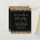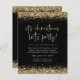 Parties scintillant d’or C’est Noël Faisons la fête Invitation noir. Un prix économique PETIT 4,5 po x 5,6 po alternatif. Disponible dans un STOCK SEMI-GLOSS 110 lb CARD qui est l'option par défaut (plus épais pour les invitations), OU un STOCK SATIN FINISH 80 lb THINNER PAPER (idéal pour les boîtiers). Les enveloppes sont en option et légèrement plus grandes que la taille de la carte. Style de glam pour votre rassemblement Festif avec fausse parties scintillant en or bordant les bords supérieur et inférieur des deux côtés et dans un script de style manuscrit pour la typographie de titre principal sur un arrière - plan noir classique. Personnalisez facilement le reste du texte à vos propres détails.