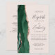 The left-hand edge of this elegant modern wedding invitation features an emerald green watercolor agate border trimmed with faux rose gold glitter. The customizable text combines charcoal gray handwriting, copperplate and italic fonts on a blush pink background. Add additional details on the back, along with a QR code to help your guests visit your wedding website.