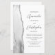 Le bord gauche de cette élégante faire-part de mariage moderne est orné d'une bordure en aquarelle grise et blanche ornée d'une parties scintillant en faux argent. Le texte personnalisable combine le script gris charbon et les polices sans serif sur un arrière - plan blanc. L'envers offre de l'espace pour les détails mariages sur un arrière - plan blanc solide, ainsi qu'un code QR que les clients peuvent scanner pour visiter votre site Web et RSVP, ce qui permet d'économiser le coût d'impression et d'envoi de cartes RSVP séparées.