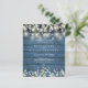 Un faire-part de mariage à budget rustique avec de jolies lampes à cordes et des feuilles sauge et lilas qui tombent sur un arrière - plan de panneaux de bois rustique bleu et vos détails mariages ensemble dans un texte classique élégant. Conçu par Thisisnotme©