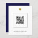 Cette invitation de feuille de papier est notre prix le plus bas dans cette conception. Le papier n'est pas aussi épais qu'un faire-part de mariage typique, c'est 12,5, et une invitation formelle est 17,5. Cette différence maintient votre coût à un bas niveau, mais vous devez en être conscient avant de commander. Cette feuille a un front blanc et un arrière - plan bleu marine foncé à l'arrière. Sur le devant de ce design minimaliste, vous téléchargez le code QR qui est lié à votre site mariage où vos invités peuvent RSVP. Vous ajouterez également vos prénoms. Au contraire, c'est l'endroit où vous pouvez ajouter un message personnel à vos invités. Utilisez notre texte comme guide pour vous aider. Pour toute question, n'hésitez pas à contacter le concepteur qui peut vous aider. Cette faire-part de mariage moderne est compatible avec les smartphones, mais aussi économique.
