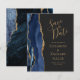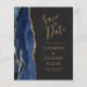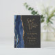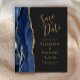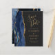 Le bord gauche de cet élégant mariage moderne, à l'exception de la carte de date, est doté d'une bordure en aquarelle bleu marine ornée d'une parties scintillant en faux or. Le texte personnalisable combine écriture manuscrite dorée, cuivre et polices italiques sur un arrière - plan noir ardoise. L'envers est assorti d'un design d'agate bleu marine et or.