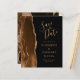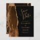 Le bord gauche de cet élégant mariage moderne sauf la carte de date comporte une bordure d'aquarelle marron mocha ornée d'une parties scintillant en faux or. Le texte personnalisable combine écriture manuscrite dorée, cuivre et polices italiques sur un arrière - plan noir. L'envers est assorti d'un design d'agate brun et or.