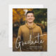 Un budget moderne Script Photo Graduation Invitation avec police manuscrite pleine saignée photo portrait sur le devant avec le nom et les détails de graduation. Le dos a une deuxième photo avec les détails de la fête. Cliquez sur le bouton Modifier pour customiser cette conception.